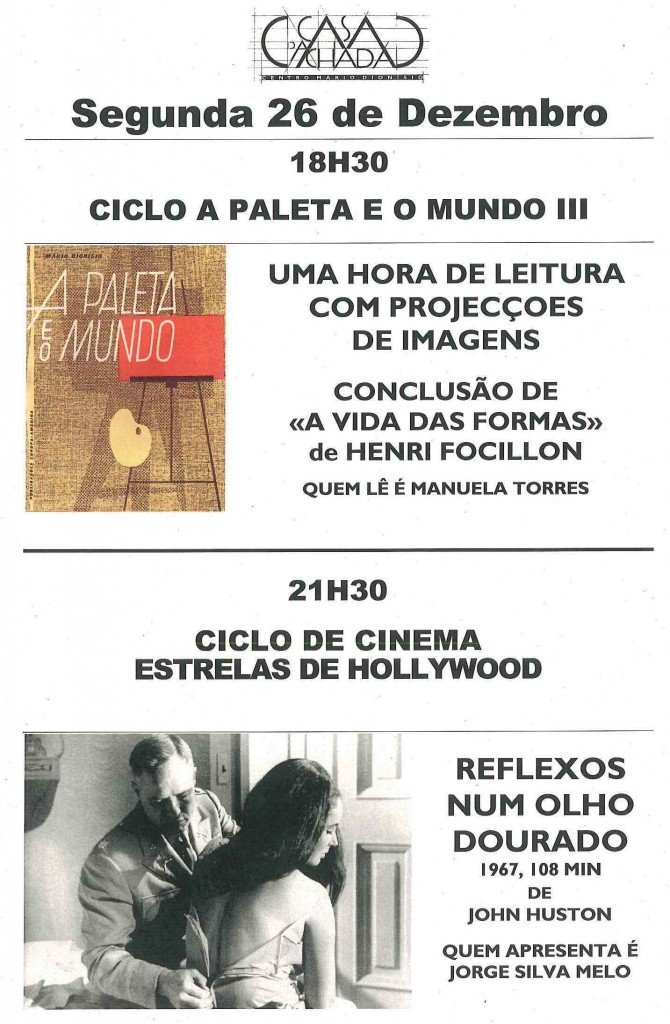À noite, pelas 21h30, termina o ciclo de cinema ‹‹Estrelas de Hollywood›› com a projecção de Reflexos num olho dourado (1967, 108 min.) de John Huston, com Marlon Brando e Elizabeth Taylor. Quem apresenta é Jorge Silva Melo. Em Janeiro começa um novo ciclo de cinema: ‹‹Rir uma vez por semana››.