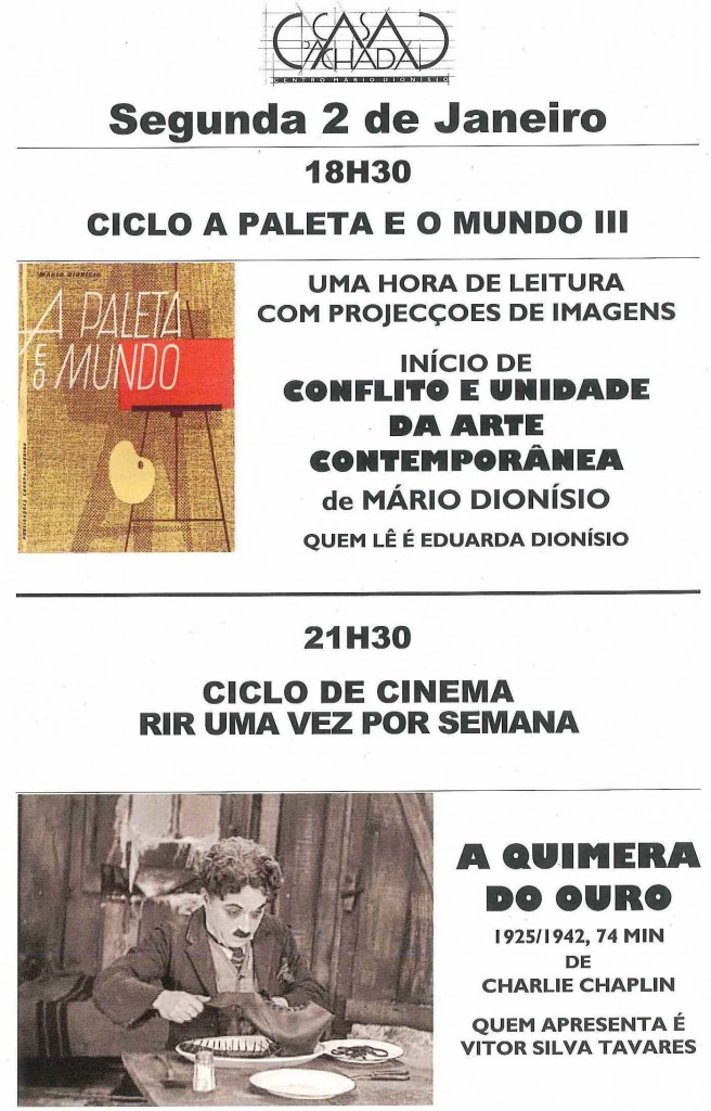 2 de Janeiro: leitura de ‘Conflito e unidade da arte contemporânea’; ciclo de cinema ‹‹Rir uma vez por semana››: ‘A quimera do ouro’ de Chaplin