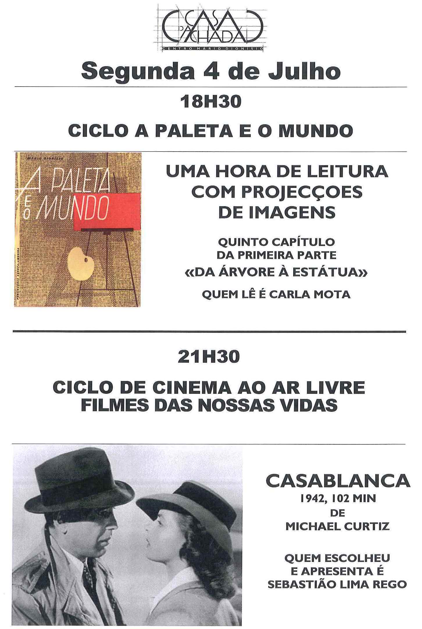 Com a chegada de Julho começa um novo ciclo de cinema, e desta vez é ao ar livre: «Filmes das nossas vidas». 13 pessoas ligadas à Casa da Achada escolheram 13 filmes que de alguma forma são os filmes das suas vidas. Começamos o ciclo com Casablanca (1942, 102 min.) de Michael Curtiz. A escolha foi de Sebastião Lima Rego, que apresenta o filme.